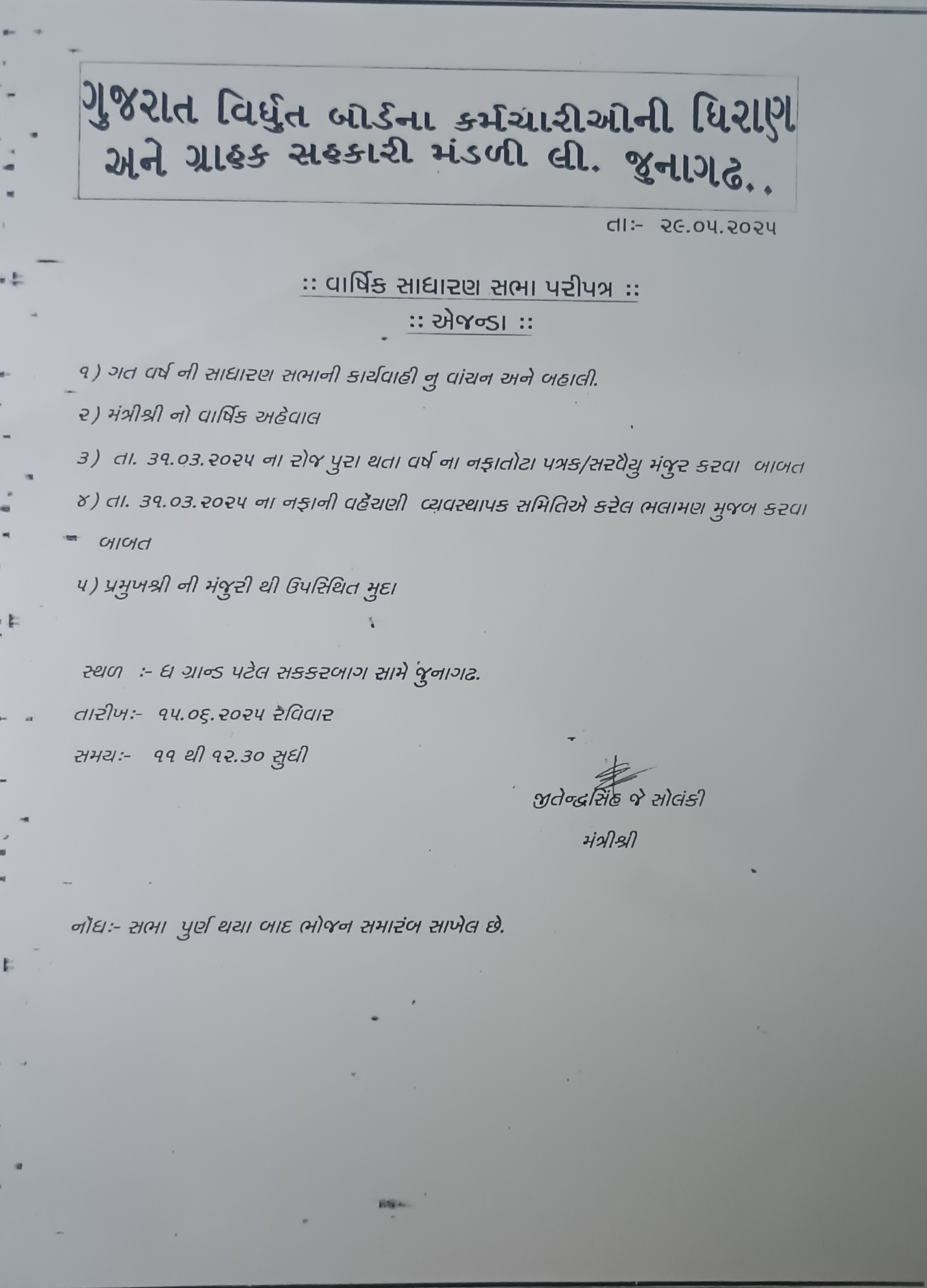 SHREE GUJRAT VIDHYUT BOARD KARMCHARIONI DHIRAN ANE GRAHAK SAHKARI MANDALI LTD. JUNAGADH